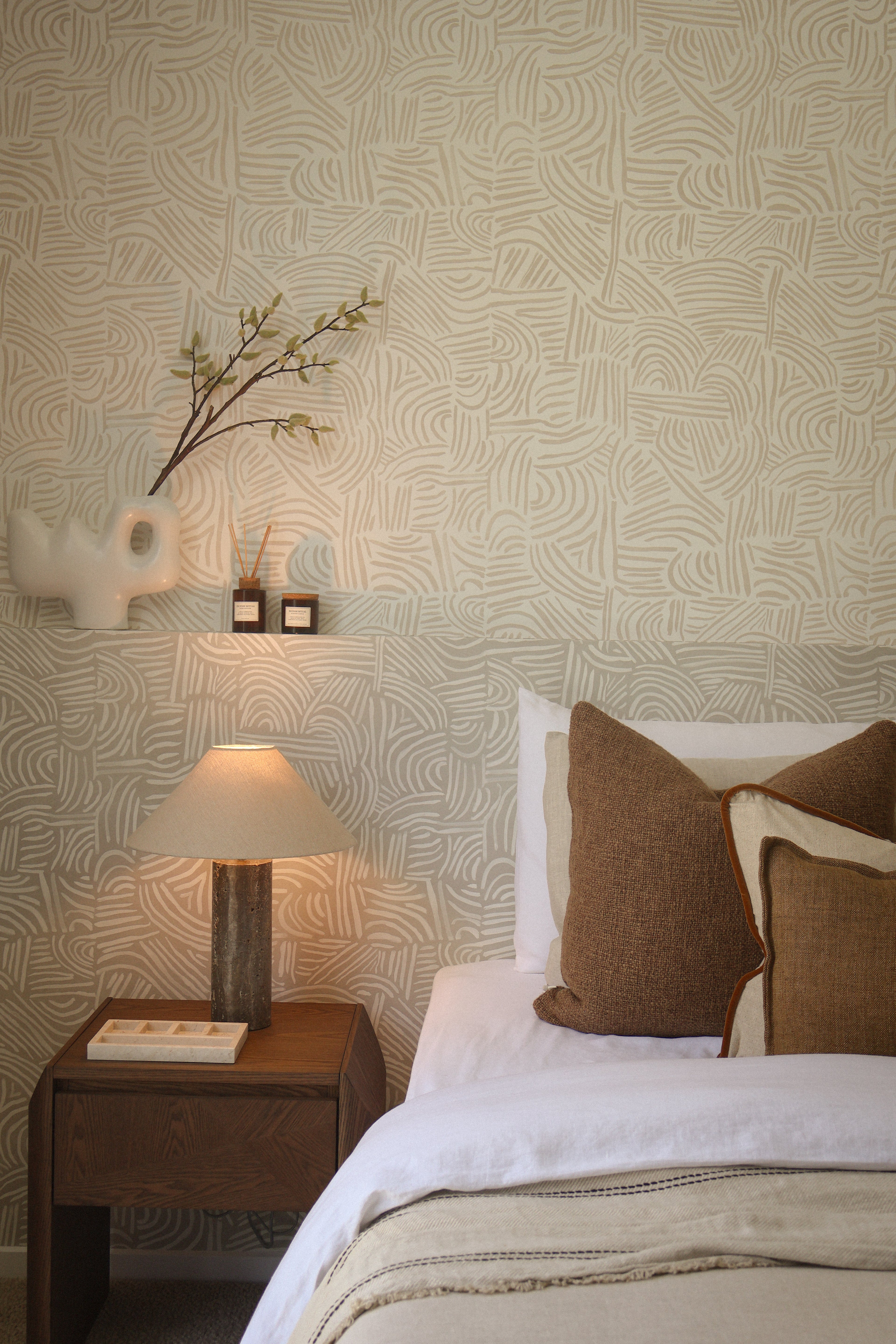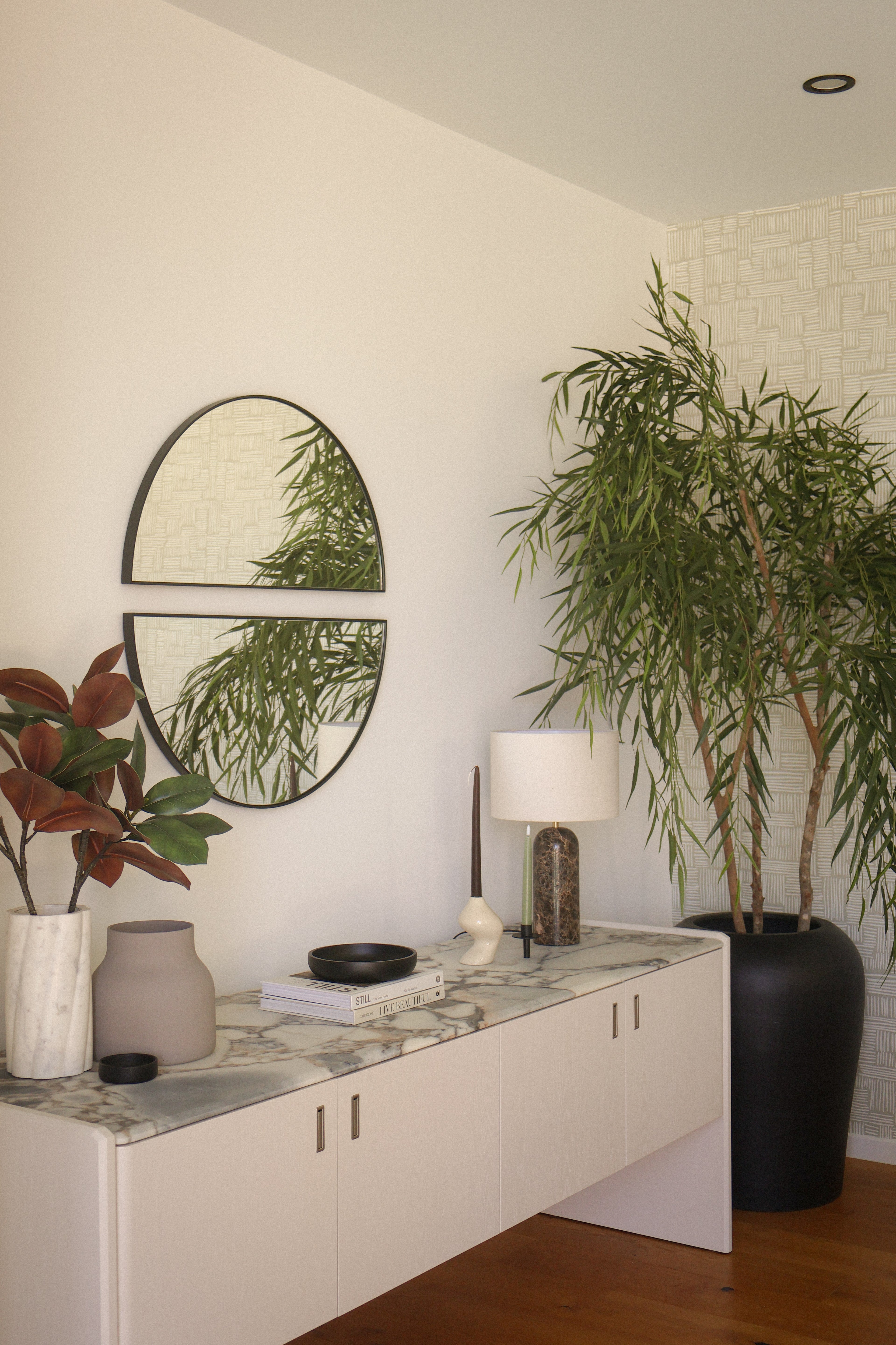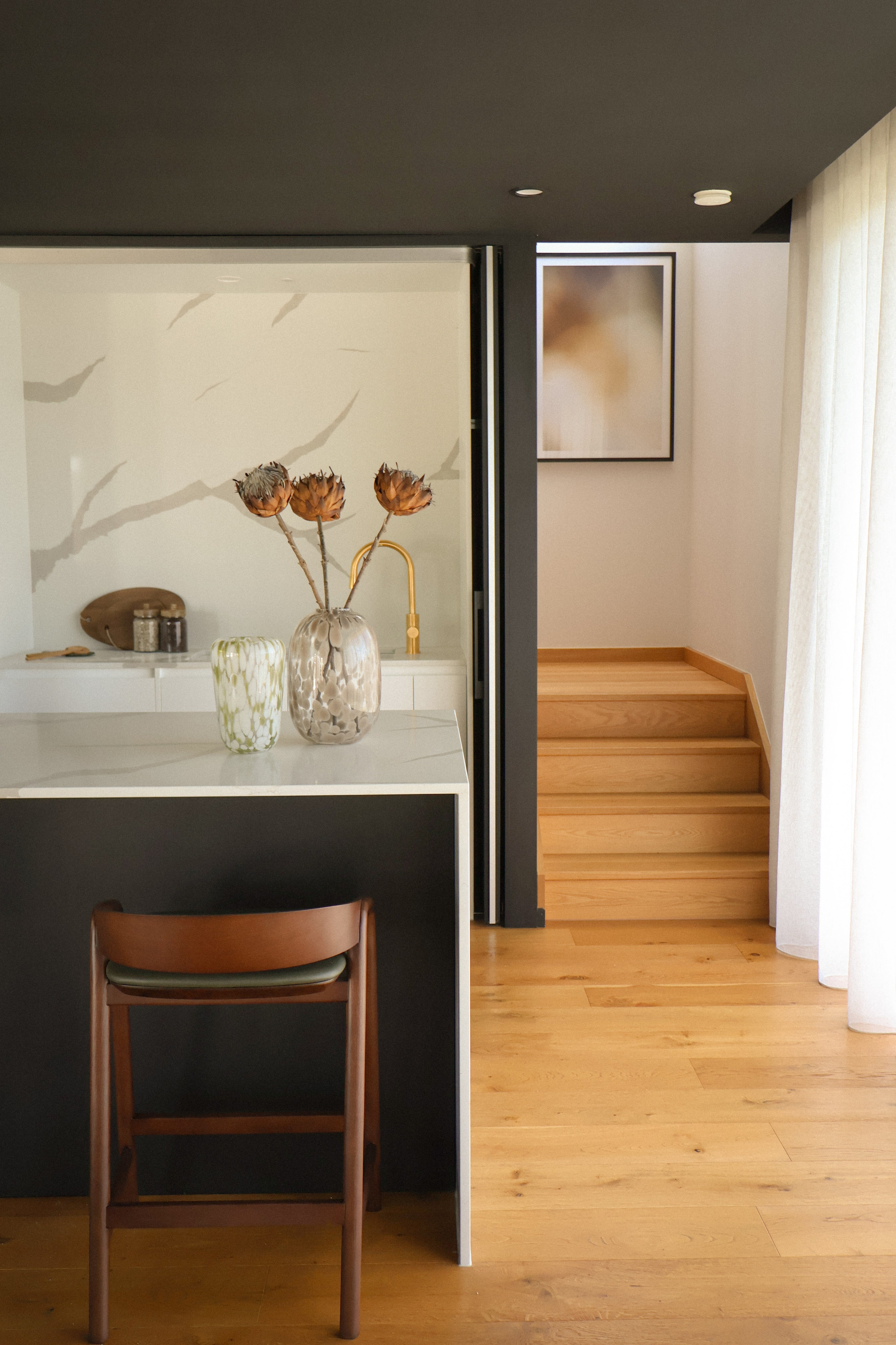 Our styling responds to this dialogue between strength and softness. Layered materials, organic forms, and a grounded neutral palette were carefully selected to complement the architecture, enhancing the home's moody elegance while ensuring it feels welcoming, liveable, and deeply considered.