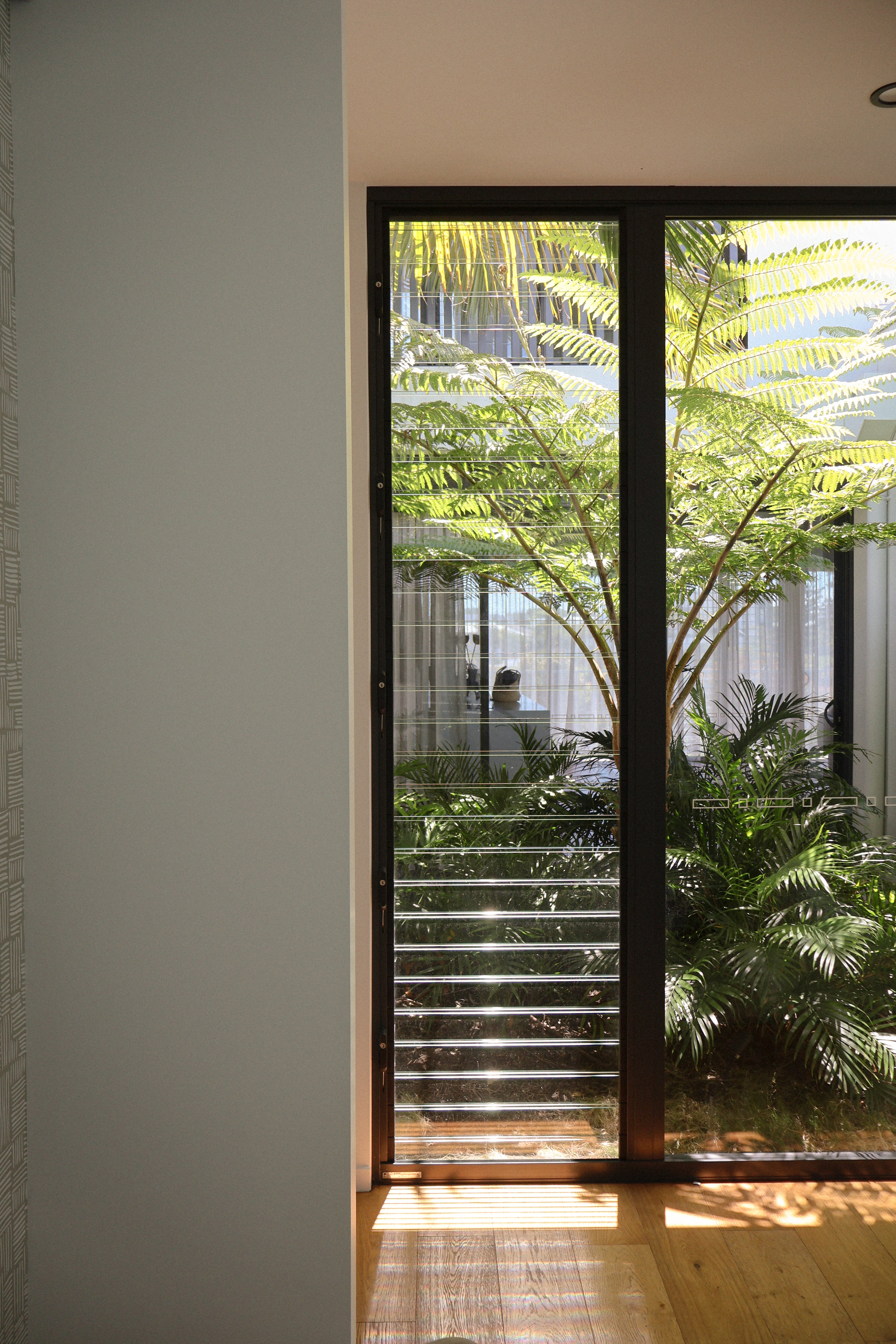 Throughout, the design plays with shadow and texture, allowing darker elements to anchor the space while creating a backdrop for warmth and softness. At its centre, a moment of greenery introduces light and life into the home. A lush, tree filled courtyard subtly opens the interiors and softens the modern palette, bringing a sense of flow, airiness, and connection to nature.