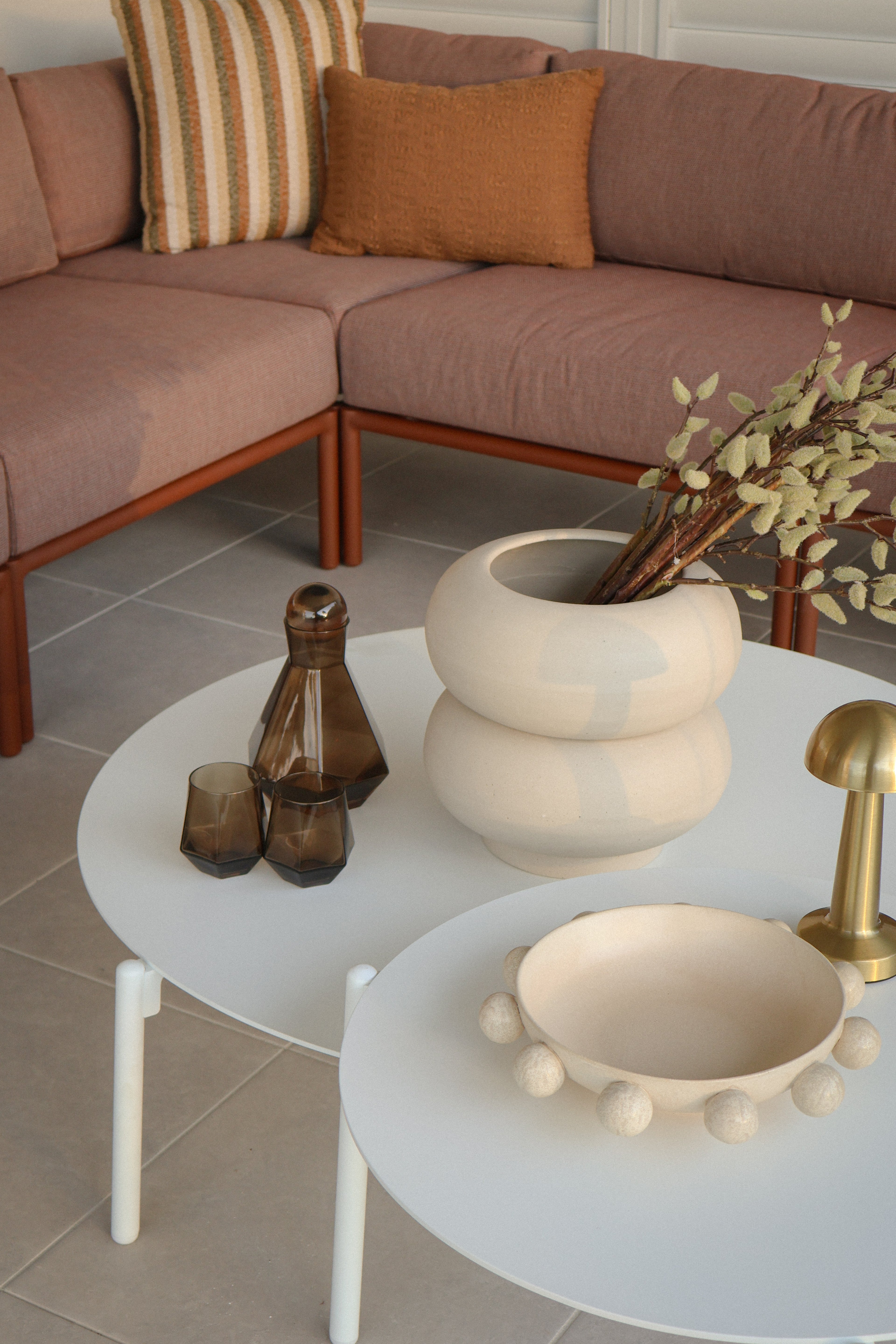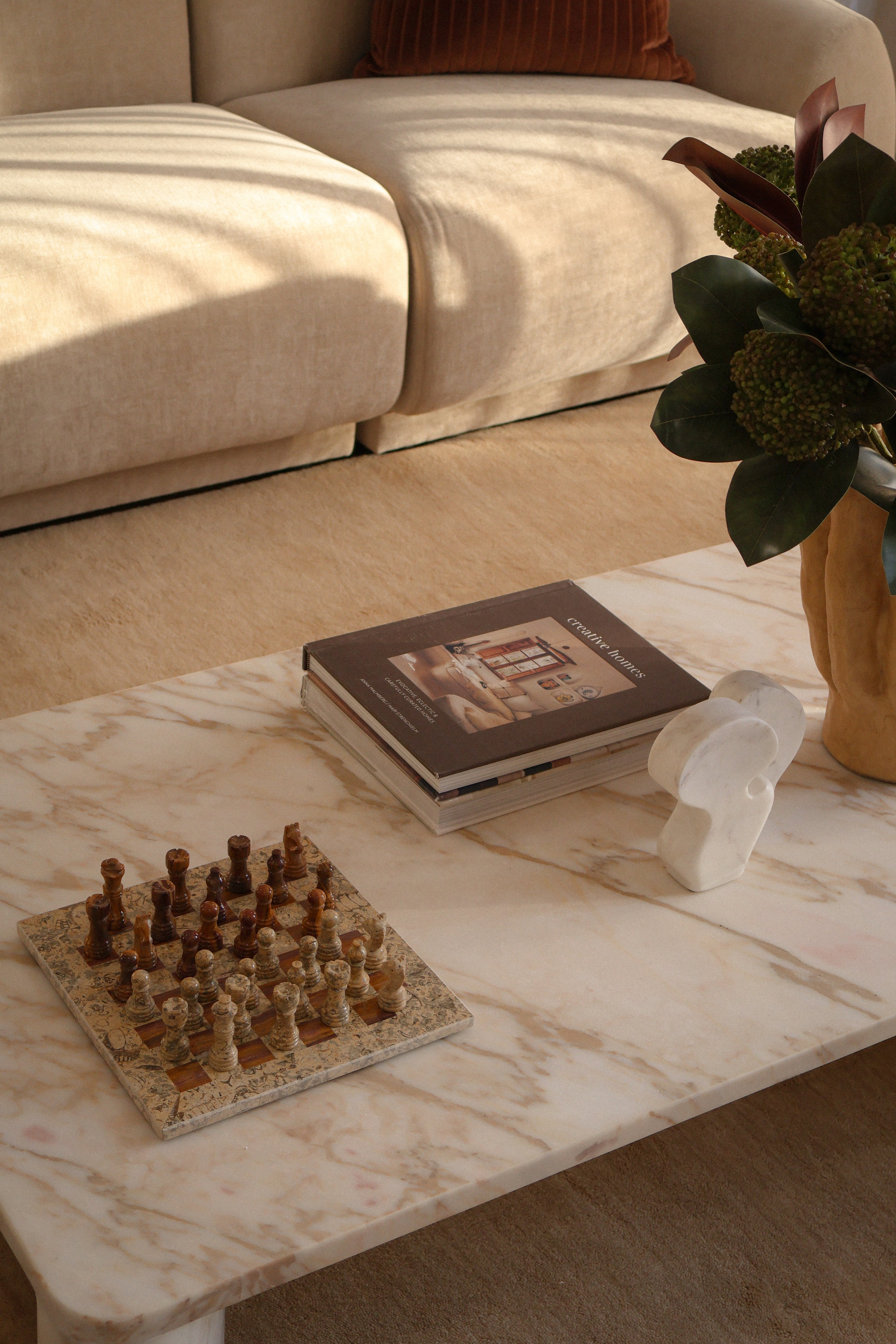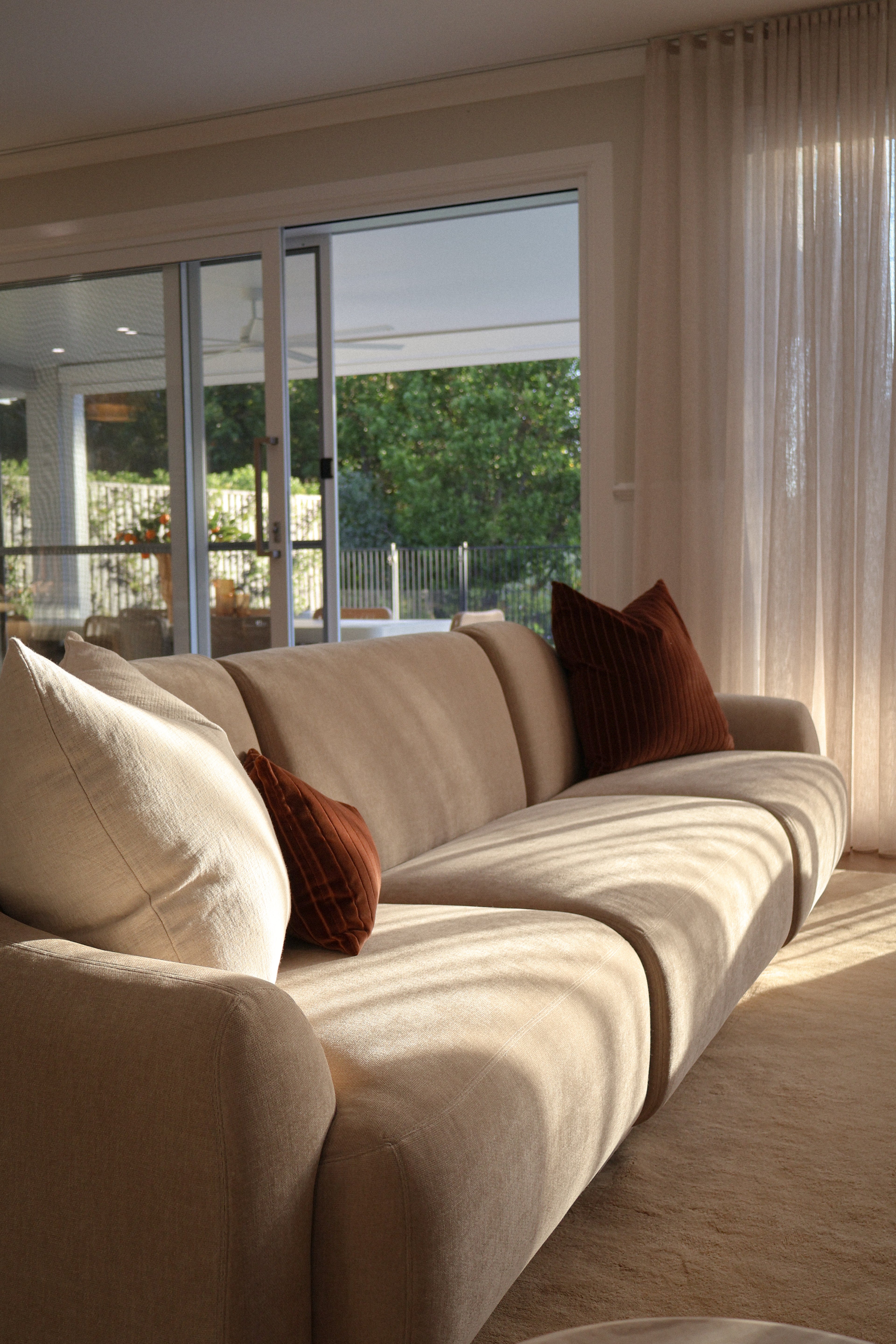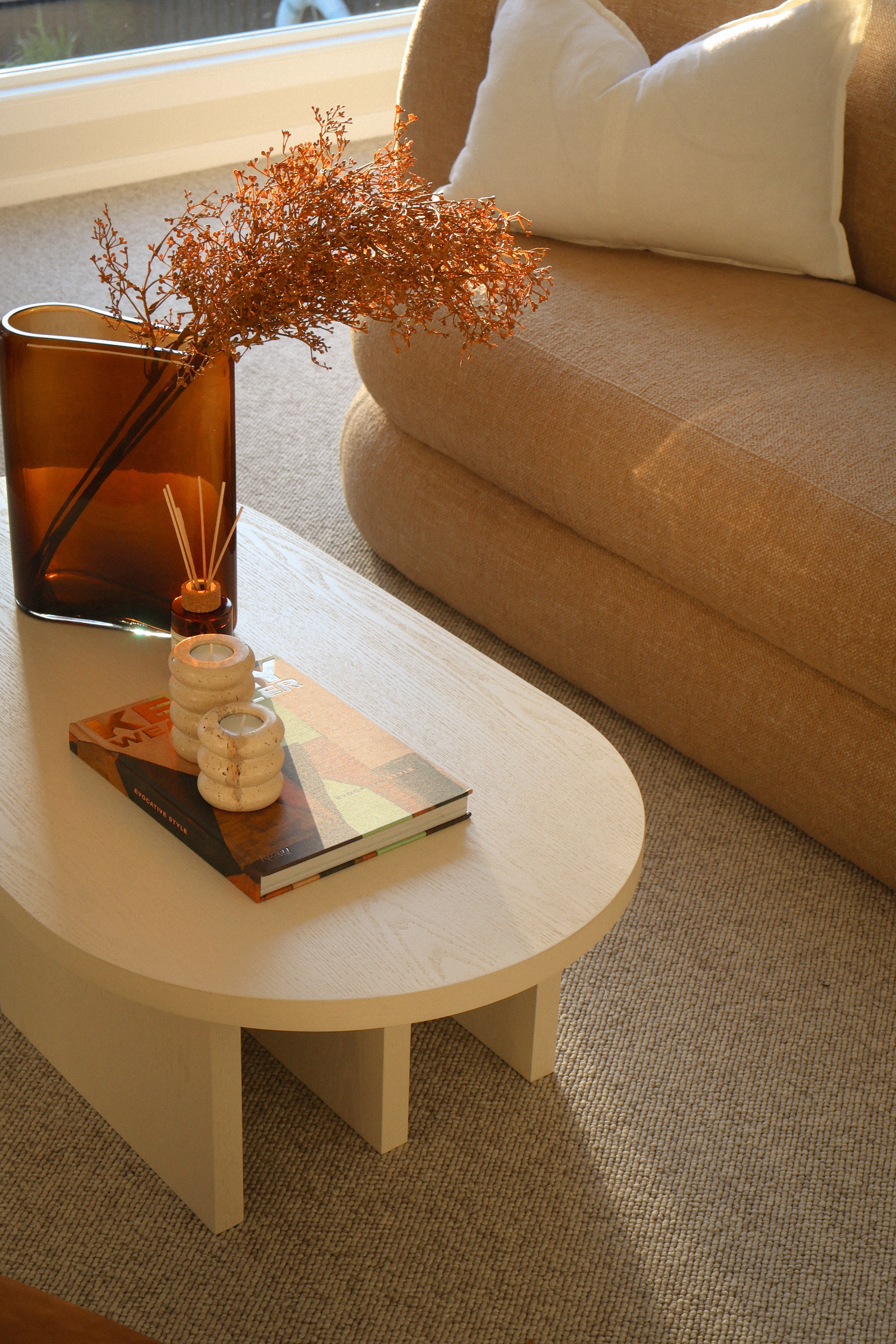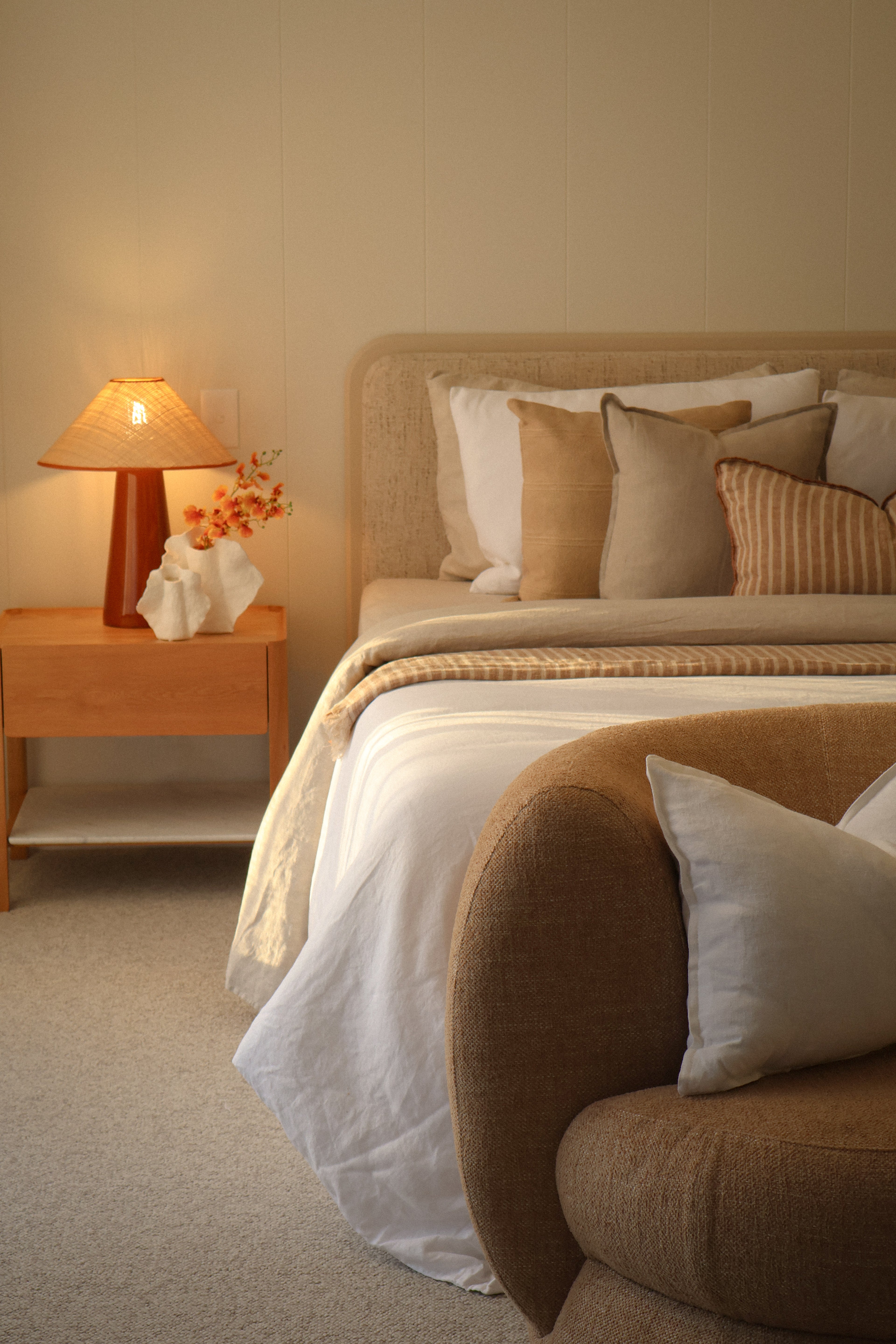 We have styled the interiors in warm whites, soft stone and sandy neutrals, layering linen textures, sculptural forms and natural timber to bring depth and ease to every space.